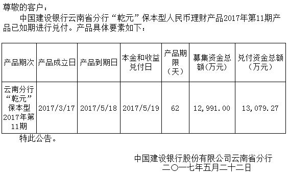 中国建设银行云南省分行“乾元”保本型人民币理财产品2017年第11期兑付公告