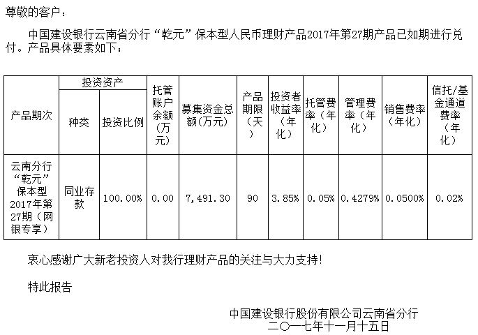 中国建设银行云南省分行“乾元”保本型人民币理财产品清算报告