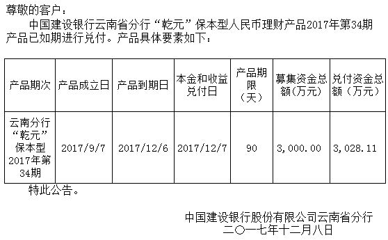 中国建设银行云南省分行“乾元”保本型人民币理财产品2017年34期兑付公告