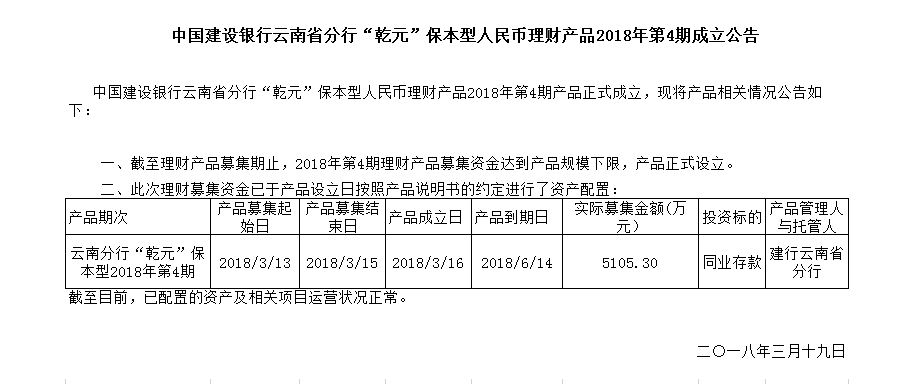 云南分行乾元保本型人民币理财产品2018年第4期成立公告