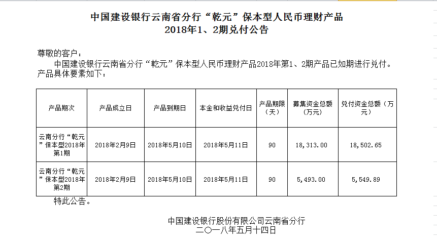 云南分行乾元保本理财产品2018年第1、2期兑付公告