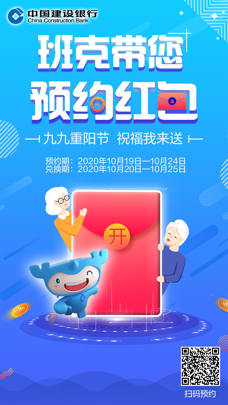 中国建设银行拟在2020年10月发行以重阳节为主题的现金红包产品,即新钞预约兑换。我行客户可通过手机银行、个人网银、移动门户,以及我行网点进行预约兑换新钞,现将有关事项公告如下: